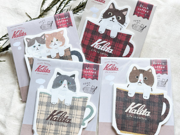 this set features cute die-cut coffee cup mini letters made by  Minowa washi paper. Perfect for pairing with a cup of coffee and finding your perfect moment. Designed with a cutout, the cat's paw serves as a charming seal, an ideal way to add a sweet finishing touch to letters or gift wrap.