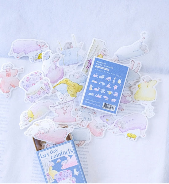 Step back in time with the "Lazy Day Comforts" Flake Stickers Matchbox Series from dodolulu. These charming die-cut stickers, illustrated in delicate watercolor and colored pencil. Perfect for adding a touch of nostalgia and elegance to your journals, planners, or scrapbooks.