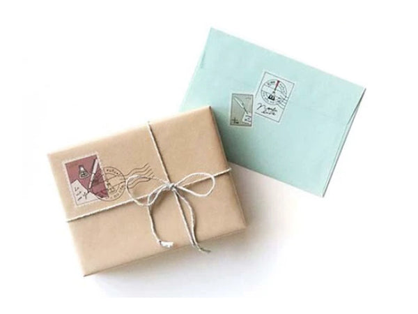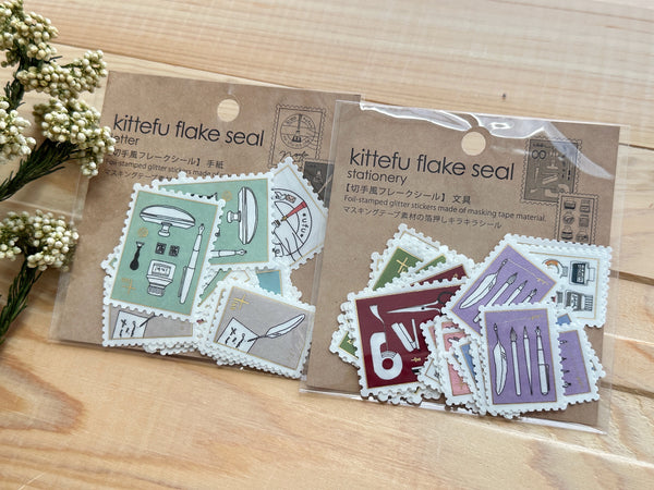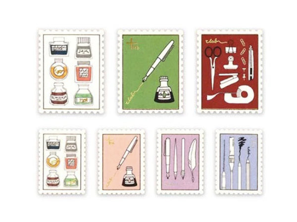 These stamp-shaped flake stickers are made from washi tape material and feature original illustrations by +lab® of stationery and letter-related items. The combination of muted colors and gold foil creates a subtle elegance. The washi tape material allows for a beautiful see-through effect on the white areas. Perfect for decorating planners, notebooks, and adding a touch of flair to envelopes and packaging.