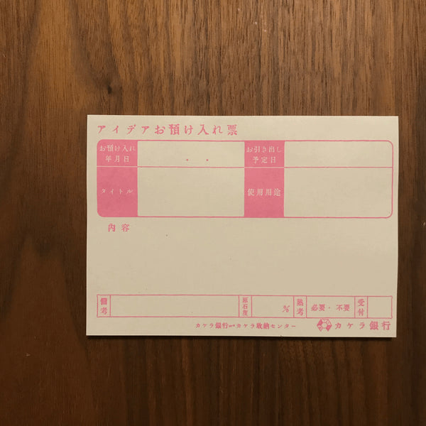 This memo pad is a replica of the official "Idea Deposit Slip" used by the bank for recording deposits. Use it to record your precious thoughts, fragments of inspiration, or any valuable kake-ra (piece/fragment) you want to keep!